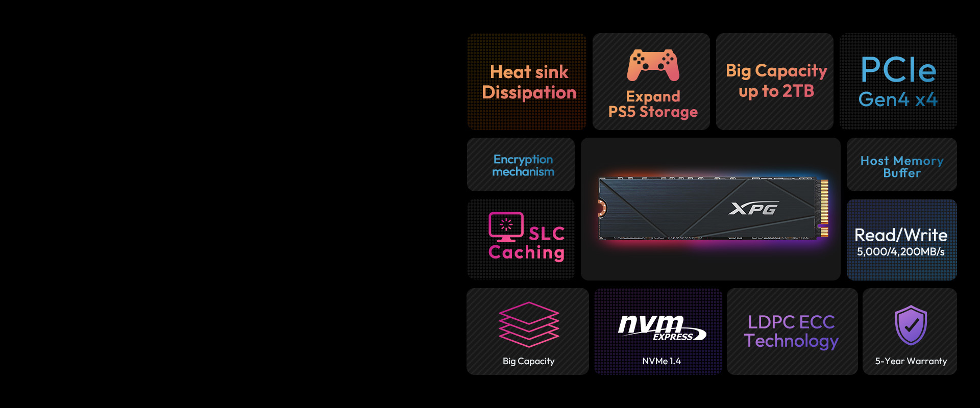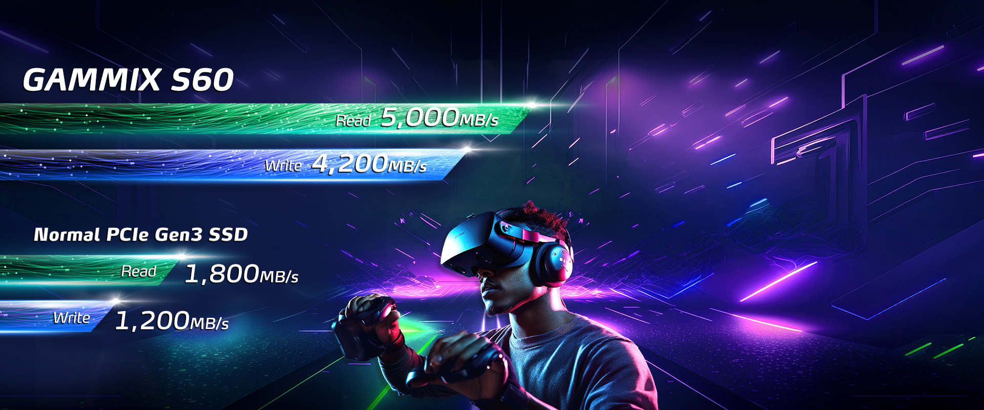 Ficando sem espaço no disco depois de instalar alguns jogos?! O GAMMIX S60 é a melhor solução para a falta de capacidade de armazenamento integrada do PS5. Seu fator de forma não apenas se adapta perfeitamente ao design do slot de memória do PS5, mas seu desempenho atende aos requisitos oficiais do PS5. Adicionar mais jogos AAA não será um problema.