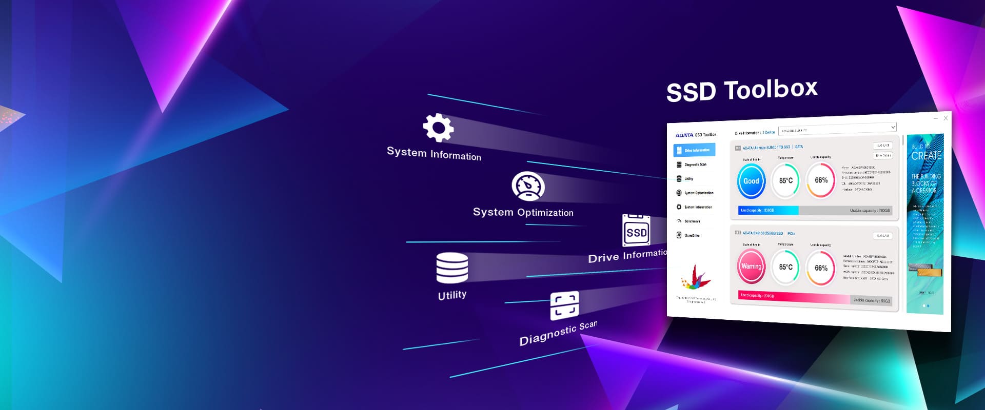 O ADATA SSD Toolbox permite o monitoramento da integridade da unidade e da vida útil restante por meio de atributos de Tecnologia de Automonitoramento, Análise e Relatório (S.M.A.R.T.). Ele também permite que você acompanhe a temperatura operacional, a capacidade e o espaço total usado, além de manter o firmware atualizado.