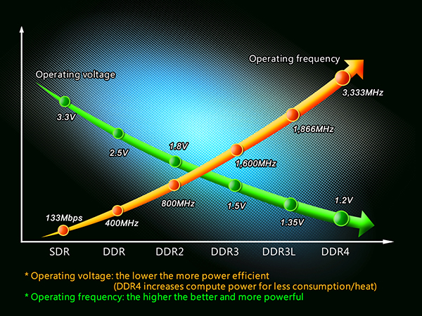 与 DDR3 相比,DDR4 不但效能表现优异,更同时具备了低耗电的优点;工作电压可由原本的 1.5V 降至 1.2V,并使系统环境保持低温,运作更加稳定。若是要超频,也只需 1.2V 的电压就能够达到 2800MHz 的运作频率。此外,XPG Z1 的 SPD (Serial Presence Detect) 已内建 Intel XMP 2.0 版本,使用者无需再另行调整 BIOS,就可即插即用,不但便利,更可让系统保持稳定。