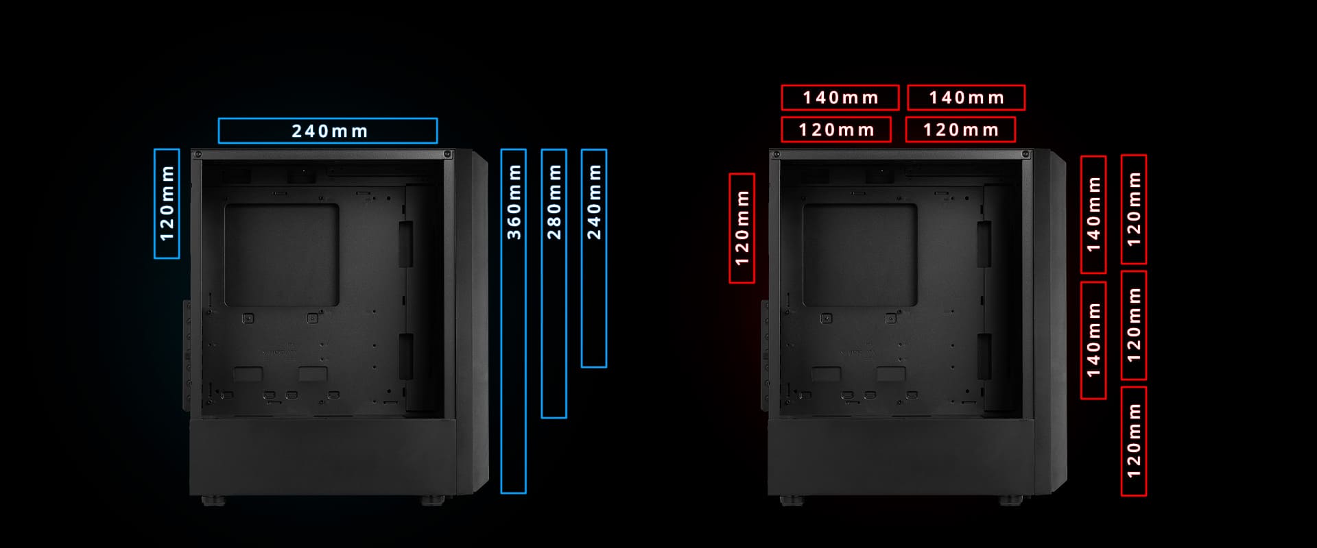 XPG VALOR STORM поддерживает до шести 120мм вентиляторов, четырёх 140мм вентиляторов, а также установку 360мм радиатора на переднюю панель и 240мм радиатора сверху.