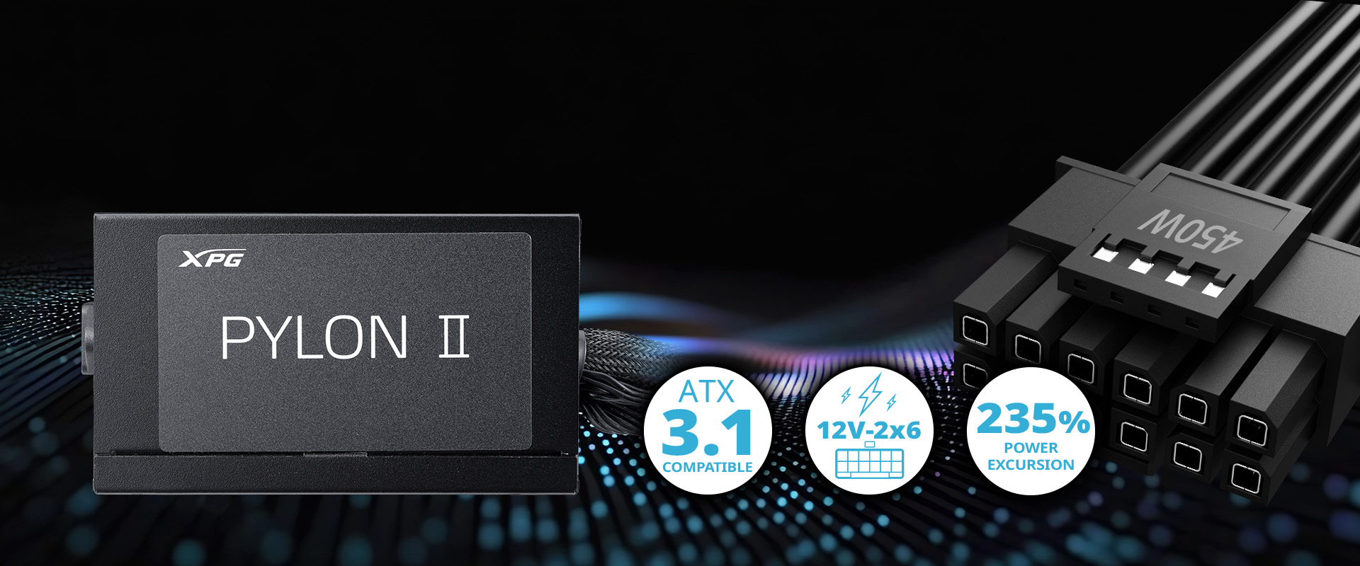 Proyectado con los últimos estándares Intel ATX 3.1, PYLON II está equipado con un conector de 12 V-2x6*, lo que garantiza la compatibilidad con componentes de alto rendimiento. Está proyectado para satisfacer las necesidades cambiantes de los sistemas modernos.