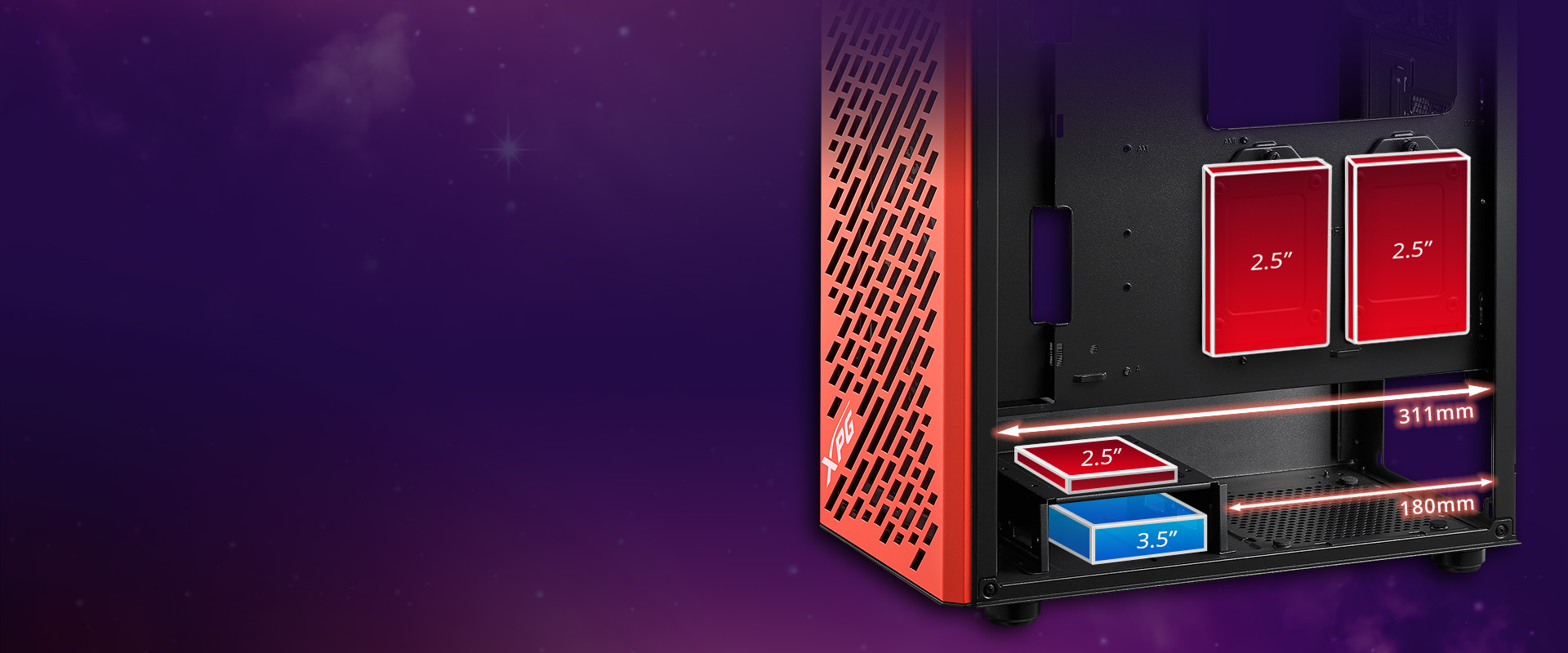 Despite its compact dimensions, the XPG VALOR AIR offers ample room for cable management; and it accommodates PSUs up to 180mm in length. The included removable HDD/SSD cage provides flexibility for storage expansion, supporting either 2x 3.5" drives or a 1x 2.5"/1x 3.5" drive combo. Moreover, VALOR AIR is capable of accommodating graphics cards up to 305mm in length, even with front fans installed, ensuring compatibility and versatility in hardware options.
