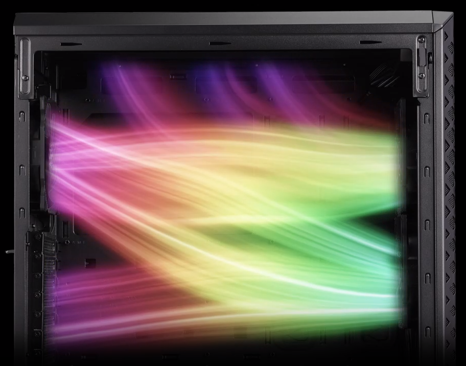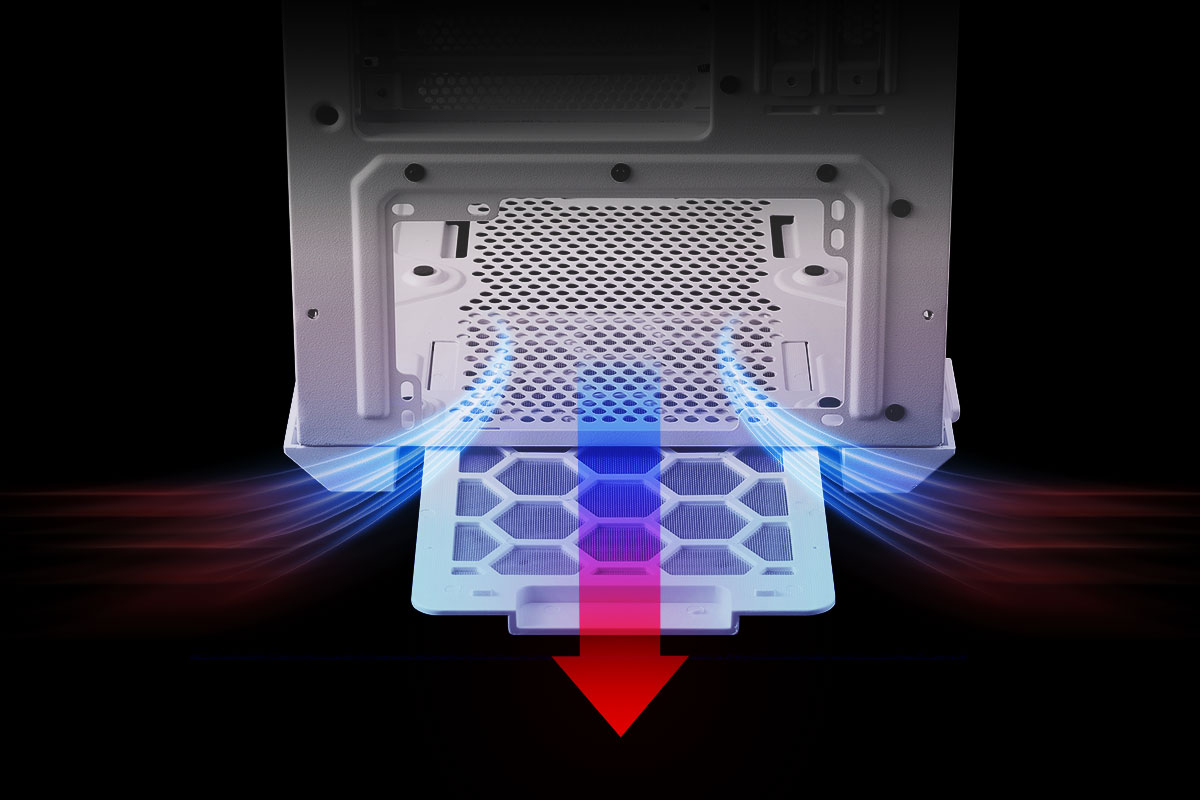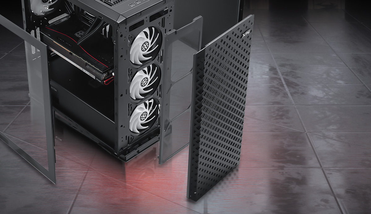 XPG DEFENDER PRO 机箱的进气散热设计,延伸到电源舱的空间。冷却进气孔设计搭配电源供应器的散热风扇,创造出顺畅且有效的散热风道。