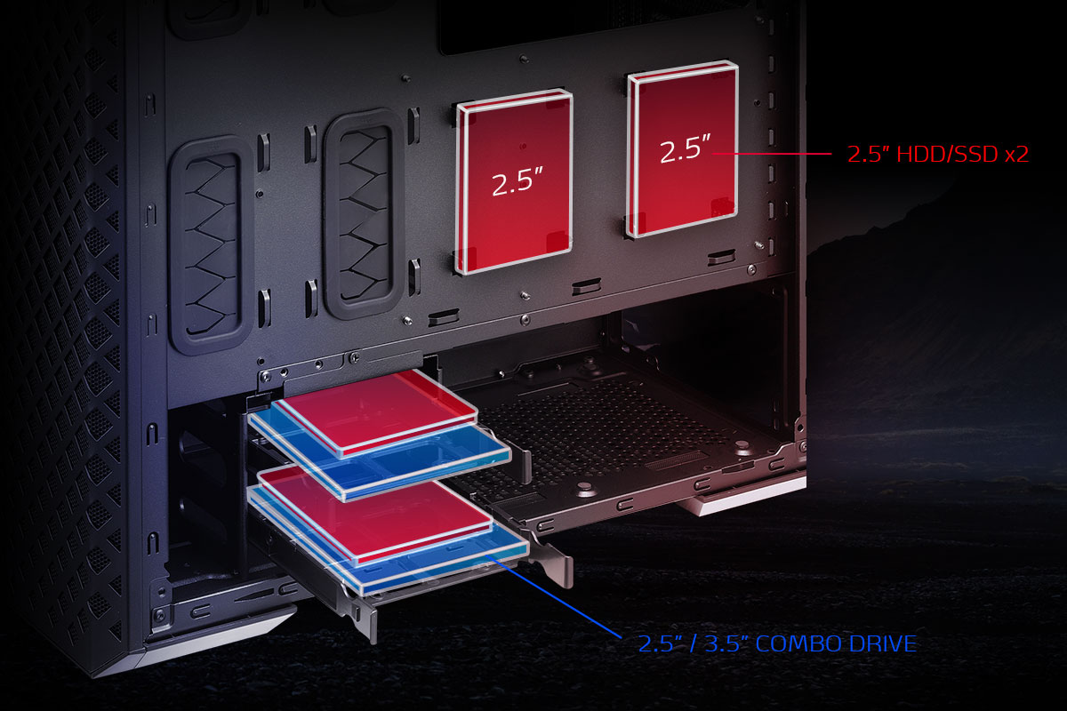 机箱背板配置 2 颗 2.5 吋的 HDD/SSD 的硬盘槽位,另外在电源舱内也附有两个 2.5/3.5 吋的 Combo Drive 硬盘槽。