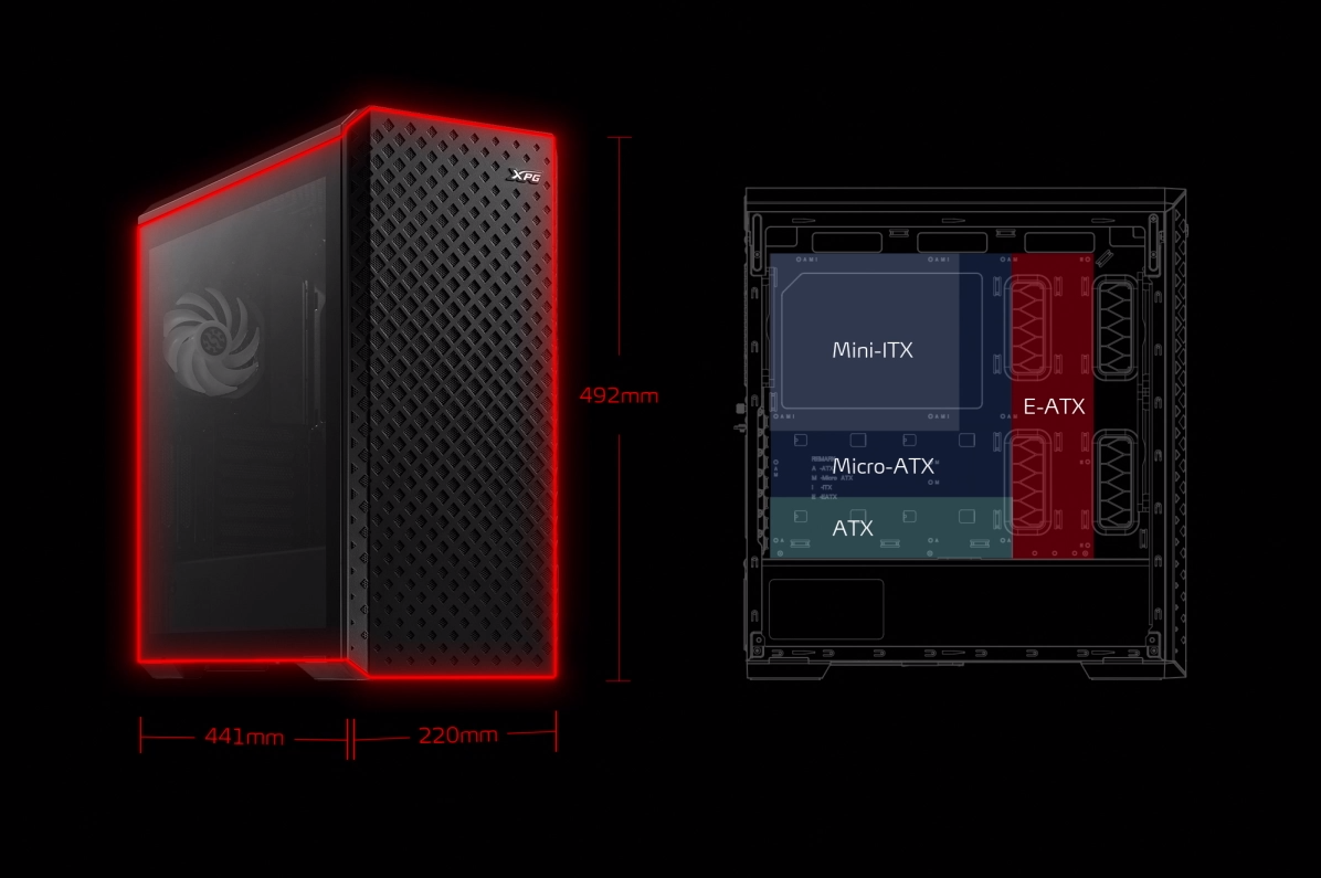 XPG DEFENDER PRO 机箱支持 E-ATX 主板尺寸,其规格(长宽高) 441 x 220 x 492(mm) 可安装以下零组件: