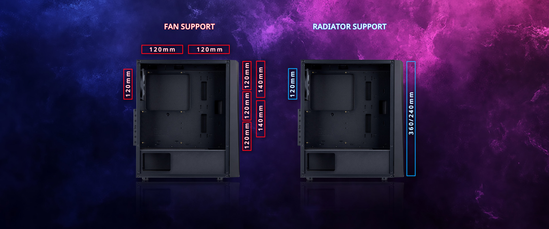 Mantenha-se fresco com fluxo de ar otimizado e configurações flexíveis—O LANDER 500 suporta um radiador de até 360 mm na frente e 120 mm na traseira, além de suportes de ventoinha adicionais na parte superior. Não importa se você usa ar ou líquido, este chassi dá espaço para seu sistema respirar.