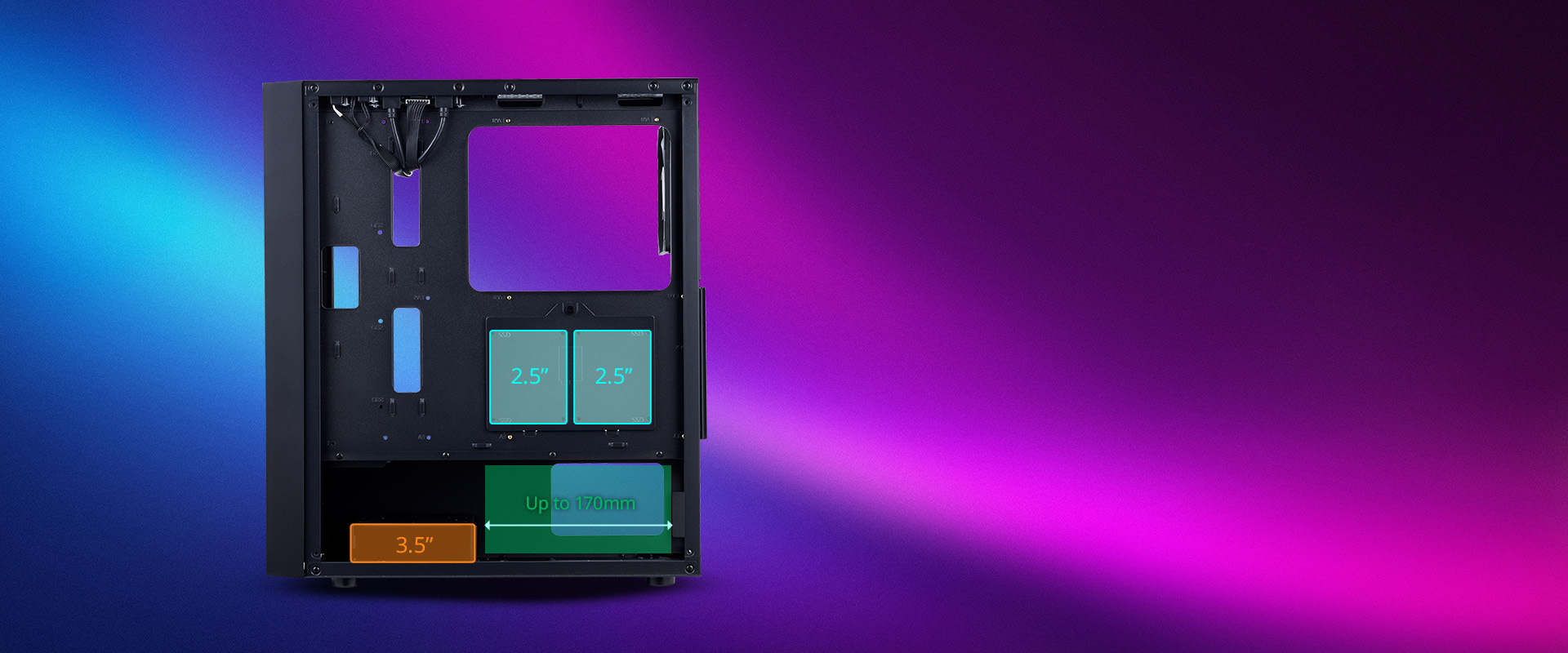 O LANDER 500 conta com baias dedicadas para dois HDDs de 3,5", dois SSDs de 2,5" e suporta fontes de alimentação de até 170 mm, proporcionando o espaço essencial para armazenamento, velocidade e estabilidade em sua montagem diária.