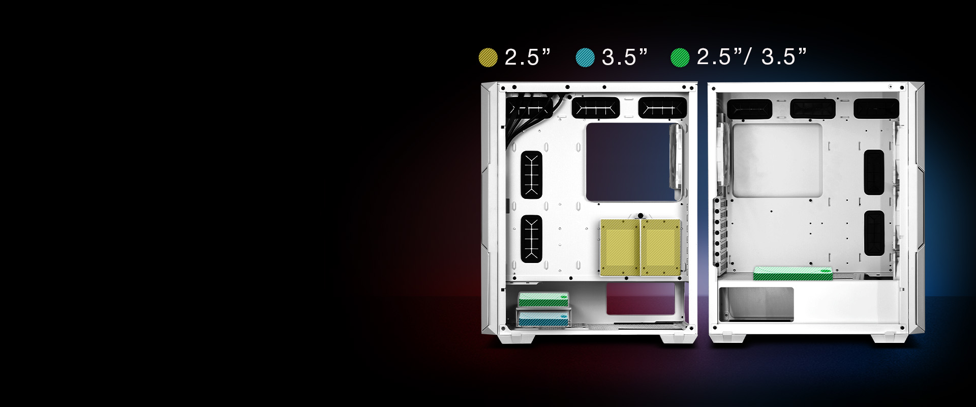 XPG STARKER AIR C 機殼提供 2 顆 3.5 吋 HDD、2 顆 2.5 吋的 HDD/SSD,以及一個 2.5 吋/3.5 吋 Combo 硬碟組合的安裝方式。