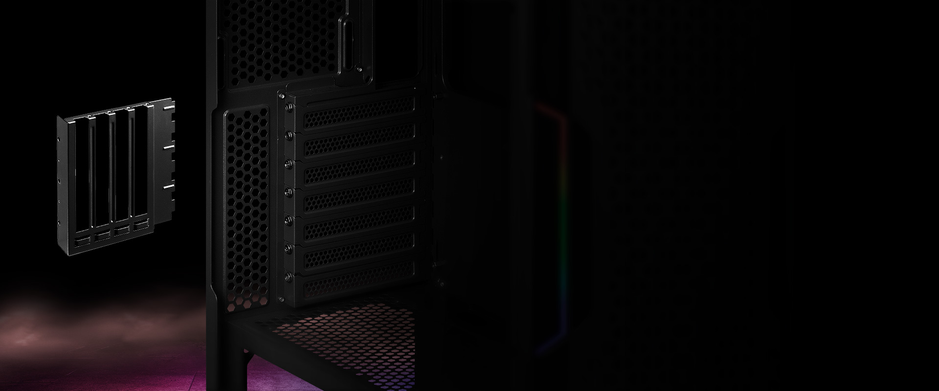 XPG STARKER AIR C 機殼導入替換式支架設計,透過特製 PCI-E 顯示卡支架方讓玩家在橫向與直立安裝間做選擇,不僅有助於顯示卡散熱,更能完整展現顯示卡燈光效果。